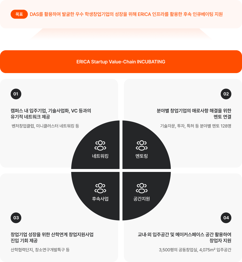 한양대학교 ERICA 창업교육센터는 Dream, Accelerate, Scale up & Sustain의 단계별 프로그램을 통해 창업 준비부터 실행, 성장까지 전 과정을 지원합니다. 교육 · 공간 · 멘토링 · 경진대회 · 학사제도를 유기적으로 연계하여 학생 창업이 실제 성과로 이어질 수 있도록 실질적인 지원을 제공하고 있습니다.
